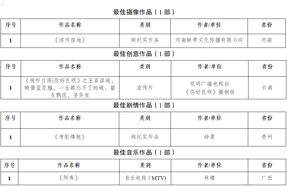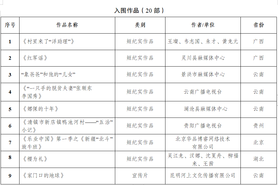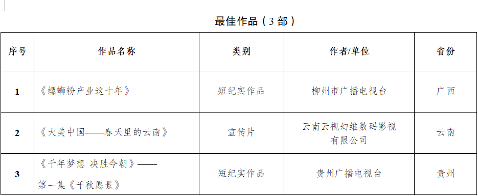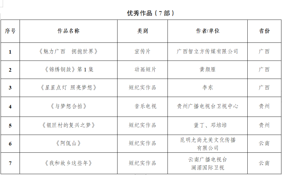 在国家广播电视总局宣传司,广西壮族自治区党委宣传部、云南省委宣传部、贵州省委宣传部指导下,由广西壮族自治区广播电视局、云南省广播电视局、贵州省广播电视局联合举办,广西广播电视台、云南广播电视台、贵州广播电视台共同承办的“我们这十年——喜迎二十大 奋进新征程”主题电视短片征集推优展播活动,自20223月启动以来,共收到参赛作品1000余部。经专家小组评定,评选出了34部优秀作品(其中最佳作品3部,优秀作品7部,最佳摄像1部,最佳创意1部,最佳剧情1部,最佳音乐1部,入围作品20部),现予以公示。